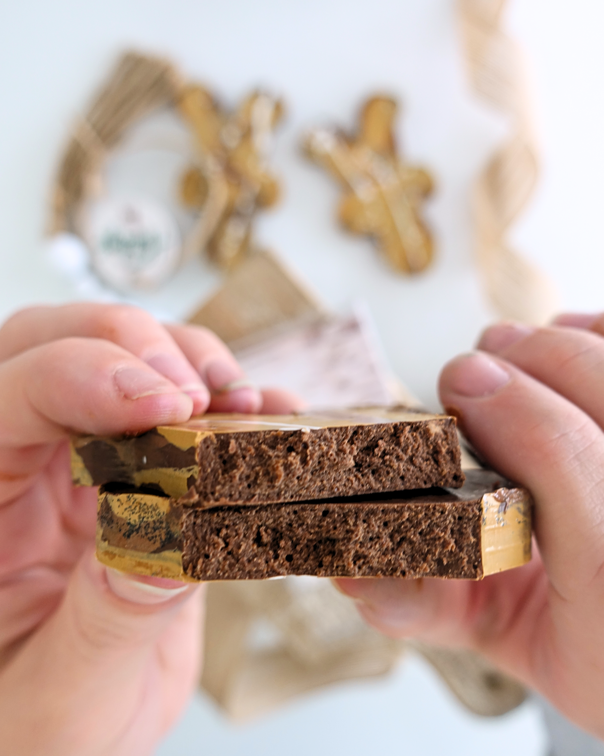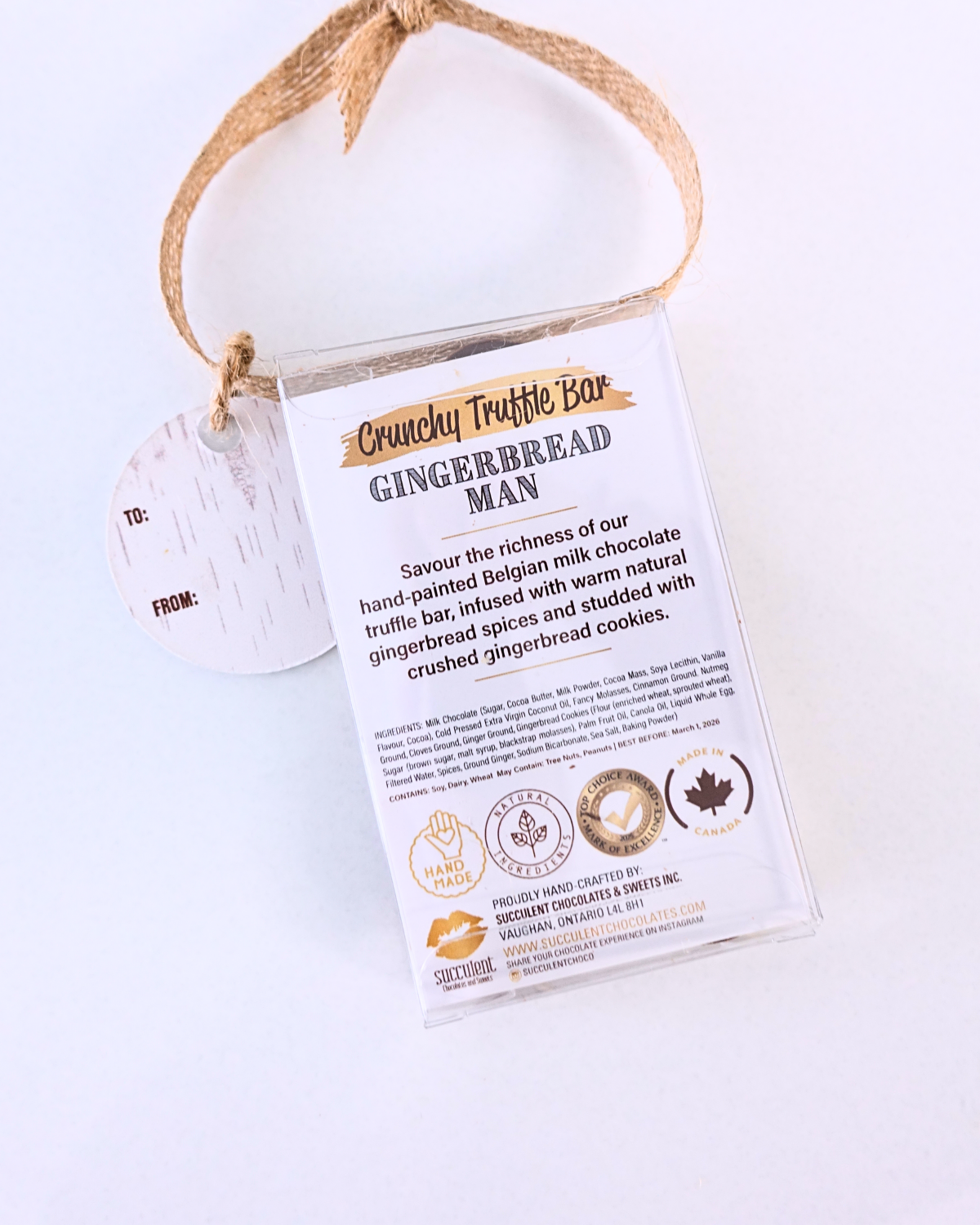 Indulge in our hand-painted Belgian milk chocolate truffle bar, infused with warm natural gingerbread spices and studded with crushed gingerbread cookies.