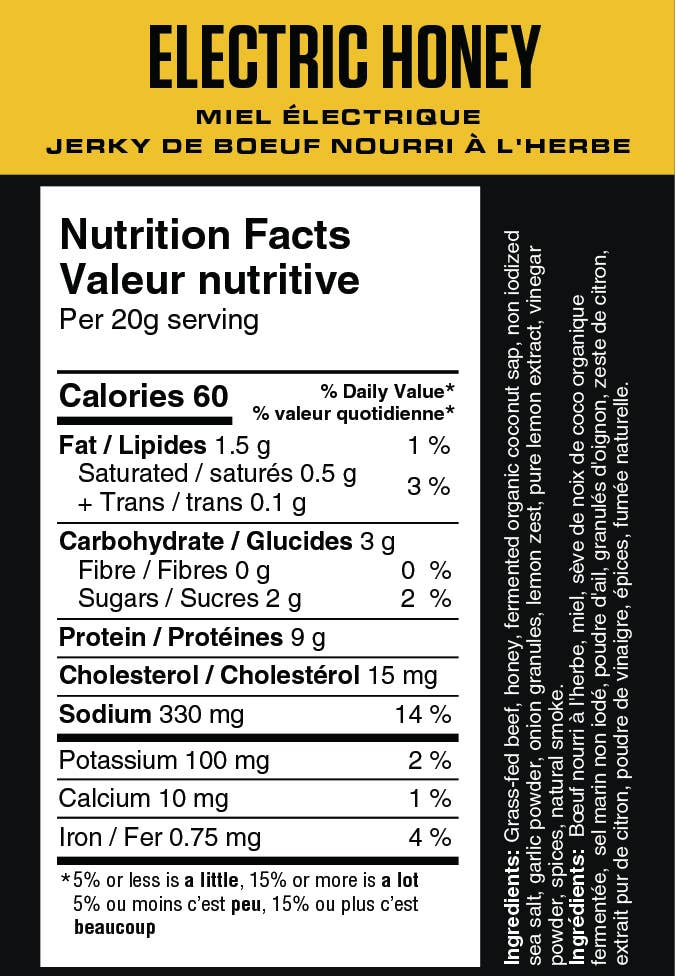 Get amped up for our Electric Honey Beef Jerky! Picture this: succulent strips of Western Canadian Grass Fed Beef, certified Grass Fed and Hormone Free, infused with the electrifying combo of lemon pepper and honey garlic. But here's the kicker – we're talking real Saskatchewan honey and zesty lemon in every bite. Wood smoked to perfection, this jerky is a flavour sensation. So grab a bag, feel the buzz, and get ready to taste the sweet, savoury, and tangy goodness in every gnarly strip! Grass-Fed Beef Sweetened with Honey No added Nitrites Low Sugar Made with simple ingredients you CAN Pronounce!