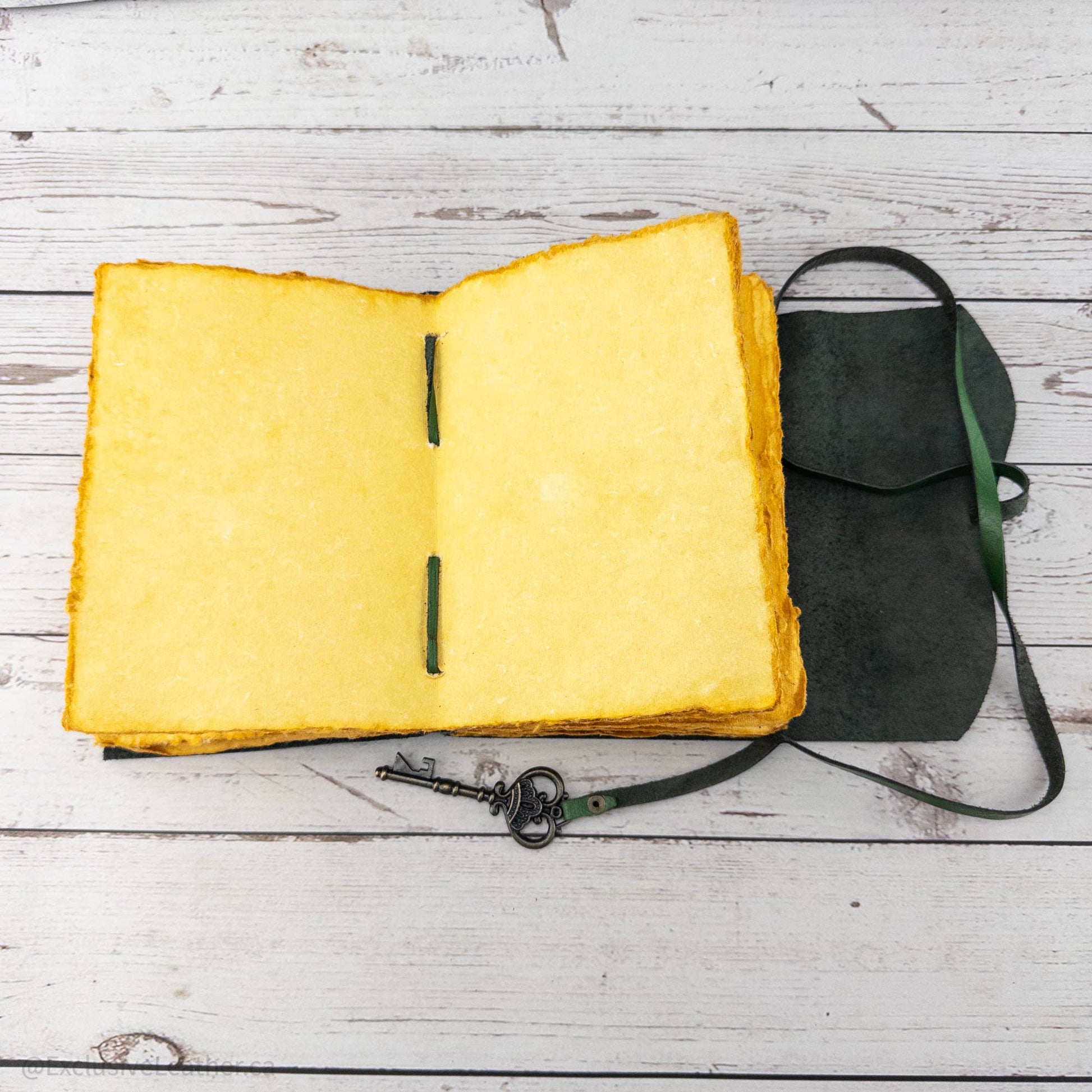 This green leather journal features a beautifully embossed design of green leaves, symbolizing nature and tranquility. Crafted from sustainable goat leather, it not only offers durability but is also an eco-friendly choice for conscious consumers. The journal is elegantly topped with a decorative key, adding a touch of charm and intrigue, making it an ideal companion for your thoughts, sketches, or notes.