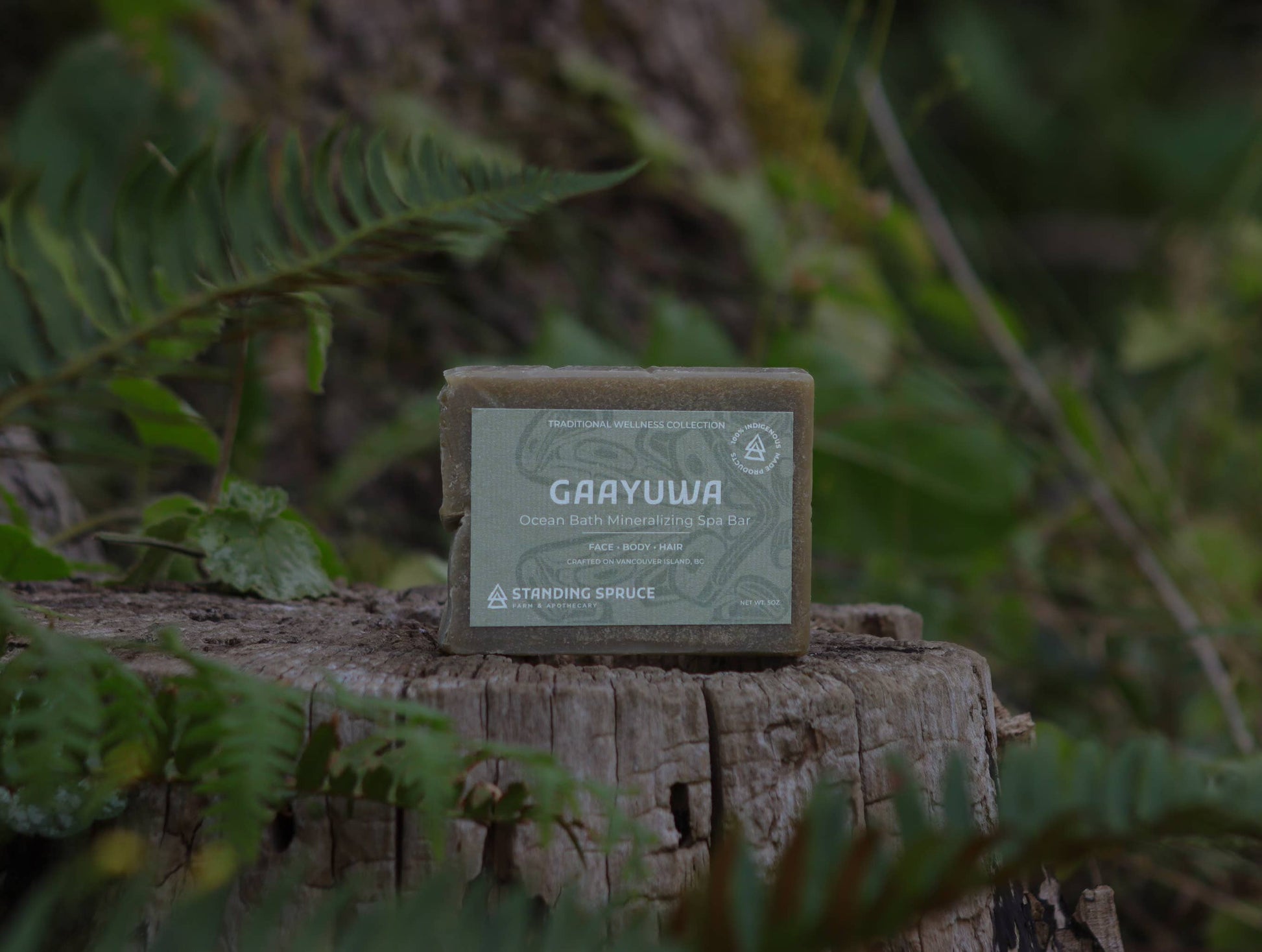 Simplicity this change of the moon had us doing what makes us happy, creating soap. A little known fact about haida people is ; we love our soap... we love soap so much that we earned the nickname “soap eaters”.. and a totally refreshing and healing yet to be named creation that sat in my mind for a very long time. This green beauty’s colour comes from antioxidant , anti-inflammatory, and healing seaweeds, kelps, and algae’s. White clay gives it a smooth hand-feel,soothing slip,and body to hair. Sea salt hardens the bar while mineralizing and softening your skin and easing your scalp creating big beachy hair. I created this soap with solitude and camping in mind. I wanted the perfect green to convey a fresh fragrance that reminded me of the the trees and ocean. Something simple that would take me back to a time when i would use one all purpose soap in my daily river or lake bath .