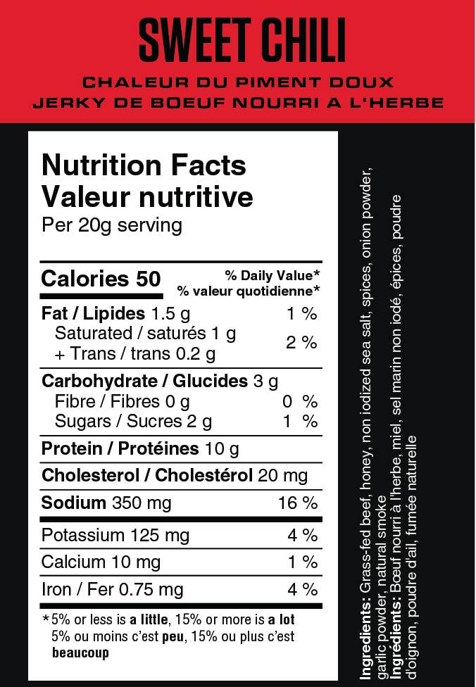 Step into flavour town with our dynamite Sweet Chili Heat Beef Jerky! Picture this: succulent strips of premium Grass Fed beef, kissed by the flames and infused with a righteous blend of sweet and spicy goodness. It's like a flavour fiesta in your mouth, with just the right amount of heat to keep things sizzlin' without leaving you gasping for air. So grab a bag, brace yourself for a flavour adventure, and let the sweet heat take your taste buds on a wild ride! Grass-Fed Beef Sweetened with Honey No added Nitrites Low Sugar Made with simple ingredients you CAN Pronounce!